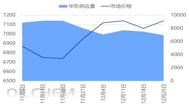 During November and December, multiple plants in East China experienced varying periods of reduced or halted production. Weekly supply peaked in early November at 9,170 tons, but by the end of December, weekly output had fallen to less than 7,000 tons, a 24% decrease from the peak. Meanwhile, the octanol market was tight, and DOP prices continued to rise. As of December 31, the price in Jiangsu was 7,350 yuan/ton, an increase of 450 yuan/ton from the beginning of November, or 6.52%. With end-users replenishing their stocks and traders making up for short positions, the supply shortage in East China intensified, leading to varying degrees of delivery delays.